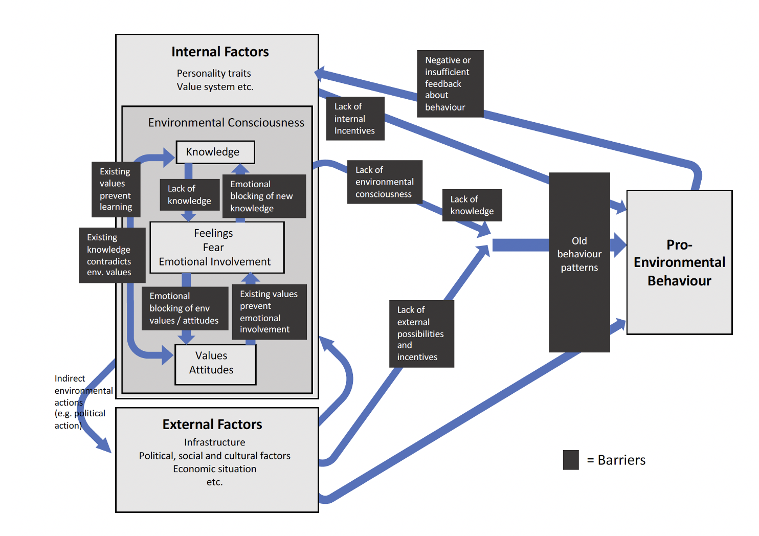 Kollmuss, A., & Agyeman, J. (2002). Mind the gap: Why do people act environmentally and what are the barriers to pro-environmental behavior? Environmental Education Research, 8(3), 239-260. doi:10.1080/13504620220145401